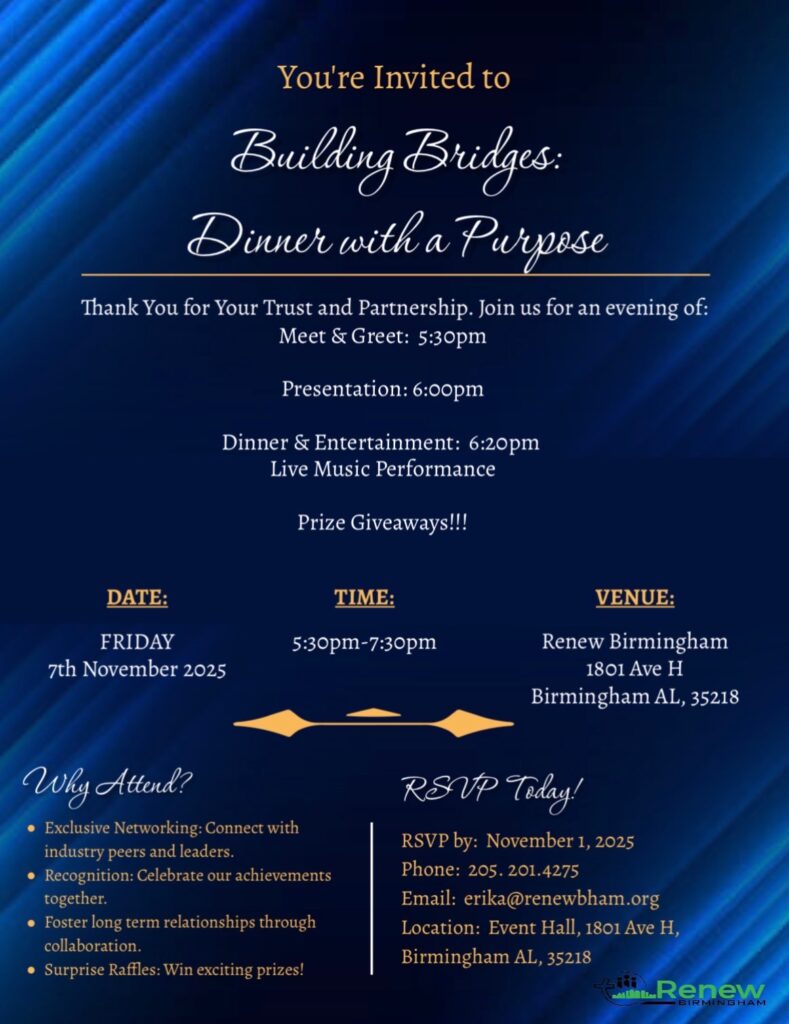 Renew Birmingham is hosting “Building Bridges: Dinner with a Purpose” an evening dedicated to fostering collaboration among community partners, leaders, and organizations. This gathering will provide an opportunity to share ideas, strengthen relationships, and discuss strategic ways to build a more connected and resilient community. Join us for thoughtful dialogue and collective visioning as we work together to make a lasting impact.