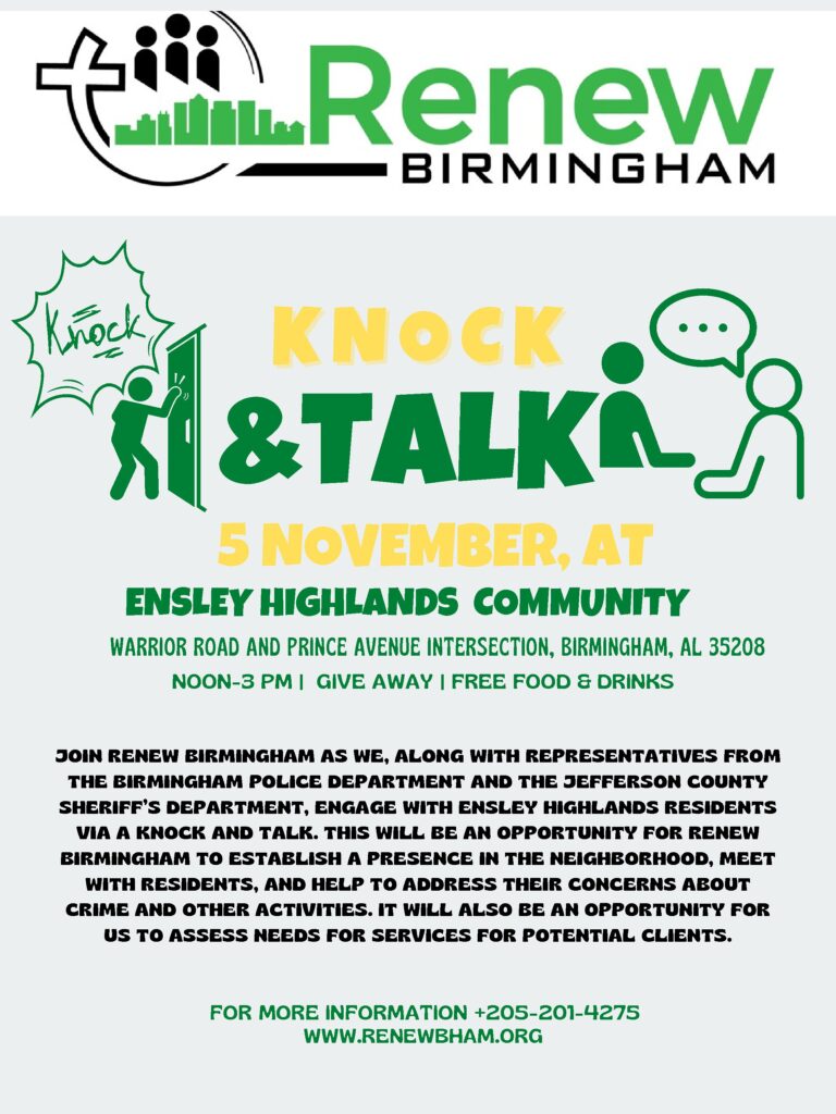 Renew Birmingham, in conjunction with law enforcement officers from the Birmingham Police Department and Jefferson County Sheriff’s Department, will host a “Knock and Talk” in the Ensley Highlands neighborhood. We are putting on this event in response to residents who have expressed concerns about the prevalence of criminal activity in the area. We will go door-to-door meeting and greeting residents and providing information about Renew Birmingham and our services. Food, music, giveaways, and opportunities to receive assistance will also be a part of this event.