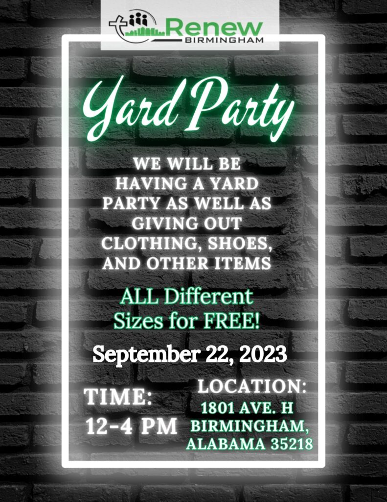 We will be having a yard party this Friday from 12-4pm. Come out and have fun with us! 1801 Ave H Birmingham, Alabama 35218.