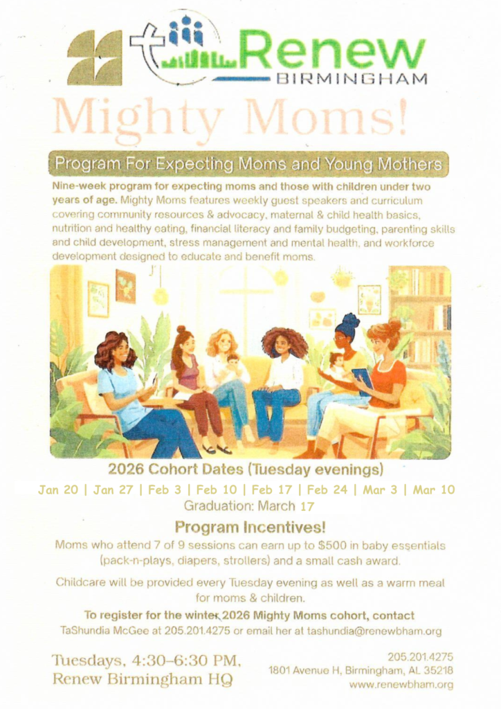 Renew Birmingham invites expectant mothers and mothers with children age 2 and under to join our Mighty Moms 2026 Winter Cohort. This cohort is designed to create a supportive space where mothers can build meaningful relationships, connect over shared experiences, and find encouragement along their motherhood journey. Participants will hear from guest presenters on topics such as maternal and child health, healthy nutrition, and stress management. Enjoy a shared meal at each session and earn opportunities to receive amazing incentives while gaining tools to support yourself and your family.