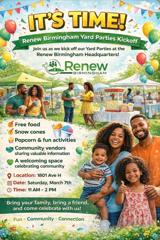 Renew Birmingham is excited to announce that Yard Parties are back! These gatherings are a chance for neighbors, families, and friends to come together, reconnect, and celebrate the strength of our community. Our yard parties are filled with music, food, fun activities, and opportunities to connect with local organizations that provide valuable resources and support. We invite everyone in the community to come out, bring a friend, and be part of the celebration as we continue building stronger, more connected neighborhoods together. We look forward to seeing you there!